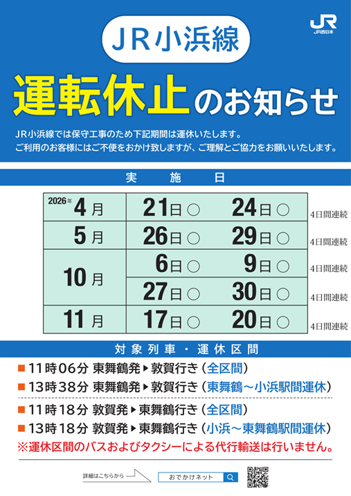 保守工事に伴いJR小浜線の一部列車が運休となります。