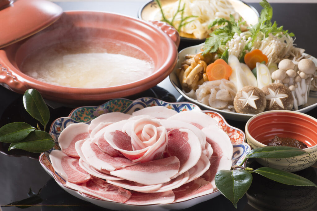 冬はジビエで猪肉のローストや山椒の効いたお味噌をつけて食べる名物のぼたん鍋はいかがでしょう。きっとやみつきになります。冬はの~んびり家族や友人とお鍋がおススメです。